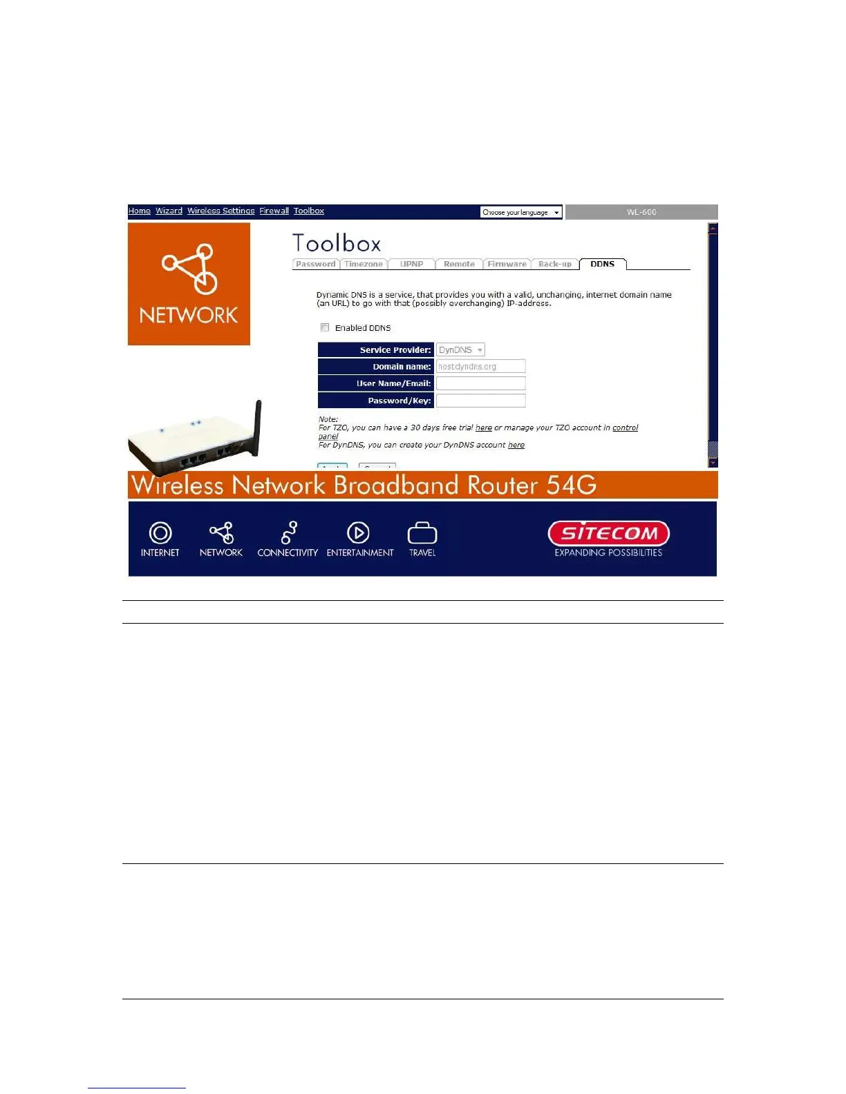 account, password and your static domain name from the DDNS service providers. This router