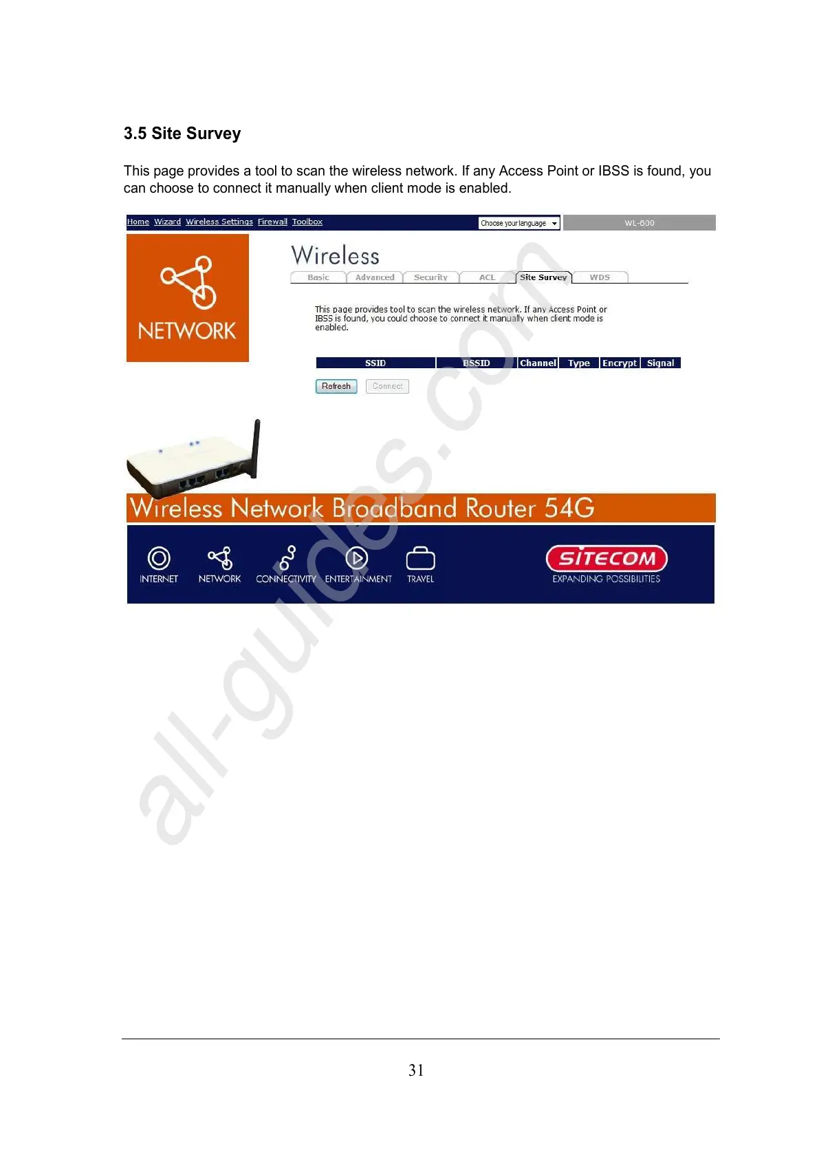 This page provides a tool to scan the wireless network. If any Access Point or IBSS is found, you