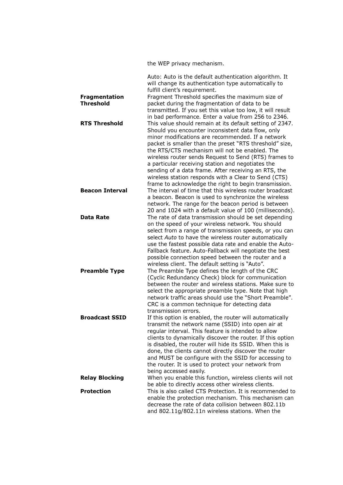 RTS Threshold This value should remain at its default setting of 2347.