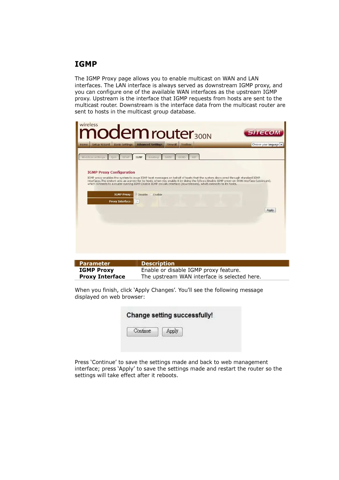 The IGMP Proxy page allows you to enable multicast on WAN and LAN