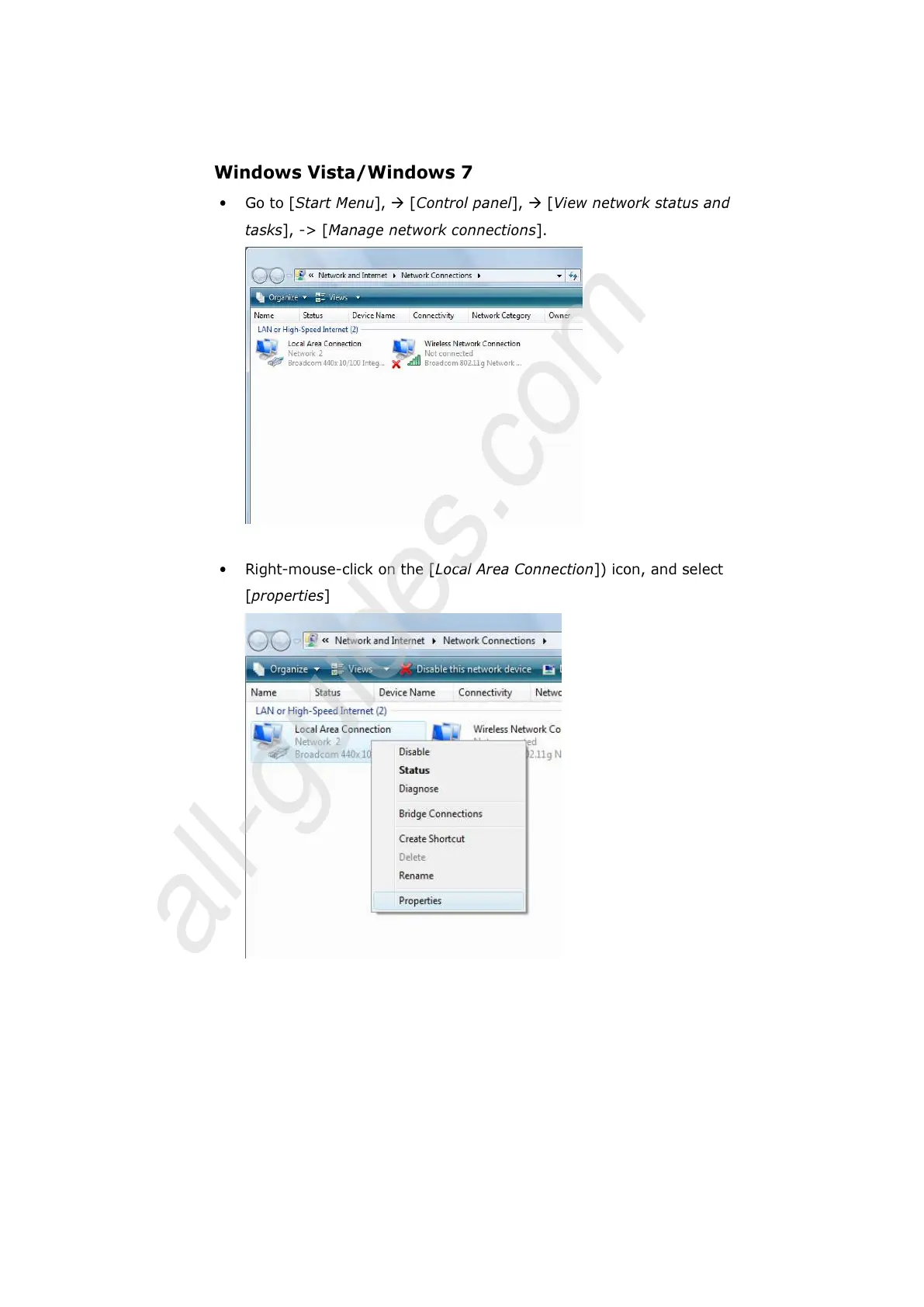 Right-mouse-click on the [Local Area Connection]) icon, and select