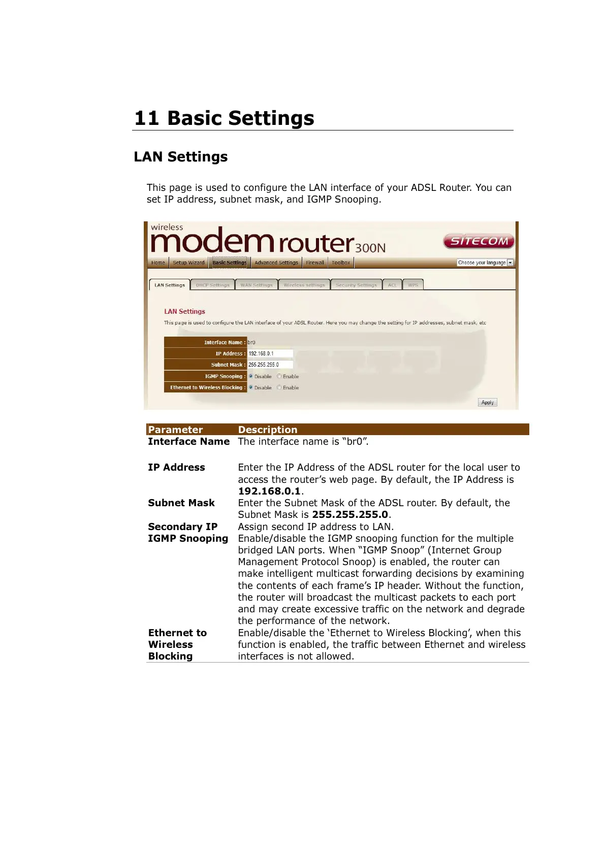 This page is used to configure the LAN interface of your ADSL Router. You can