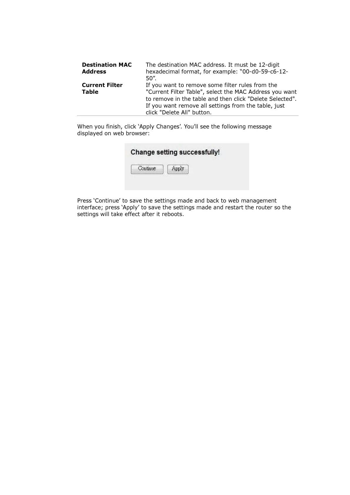 interface; press ‘Apply’ to save the settings made and restart the router so the