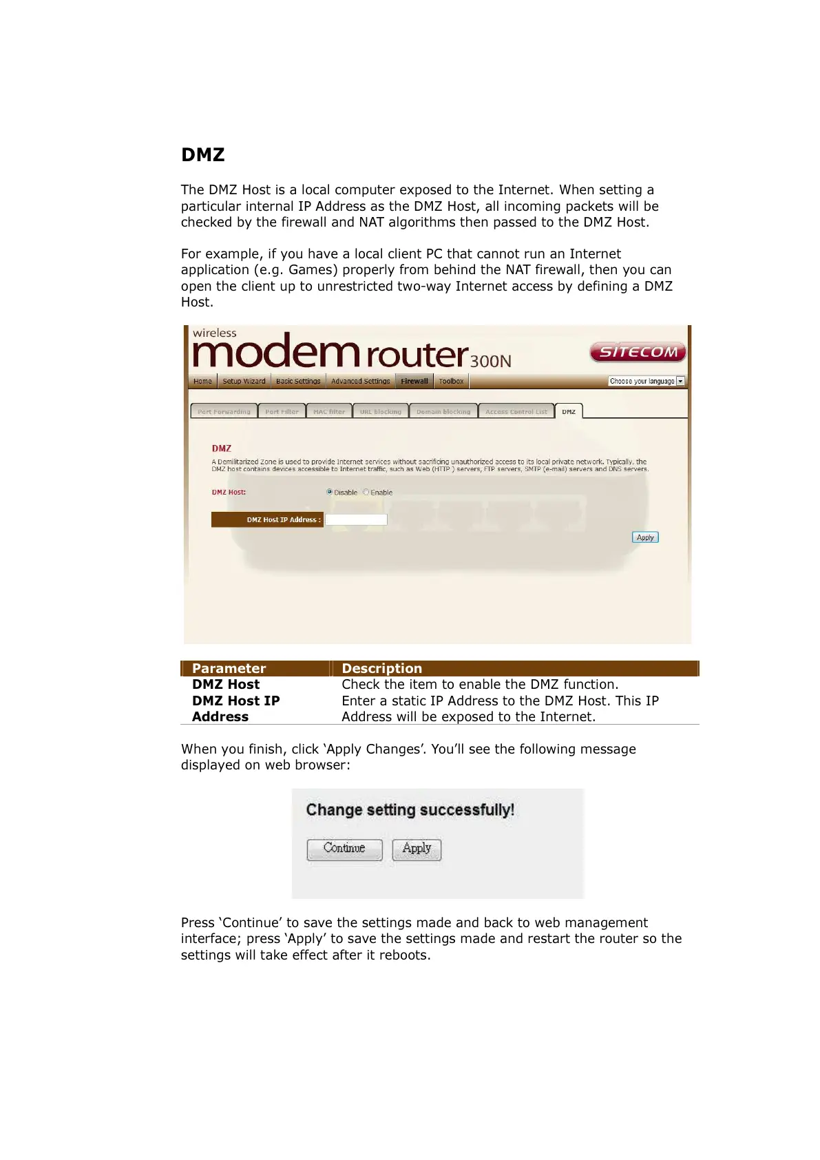 DMZ Host Check the item to enable the DMZ function.