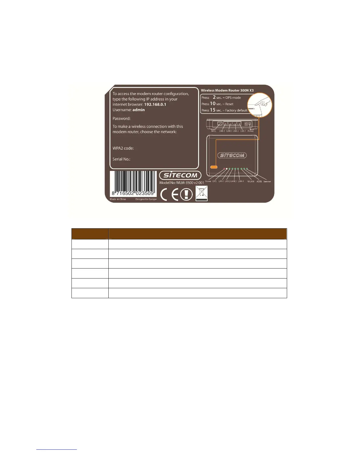 The back label describes the corresponding LED indications and port functionality.