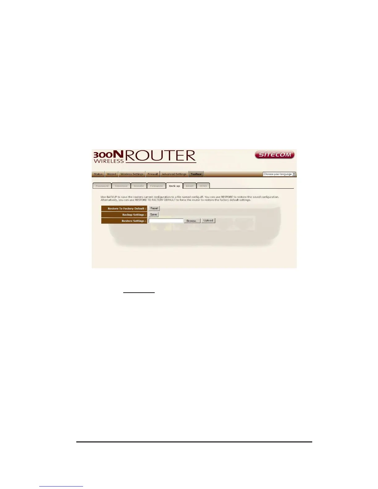 The Backup screen allows you to save (Backup) the router’s current