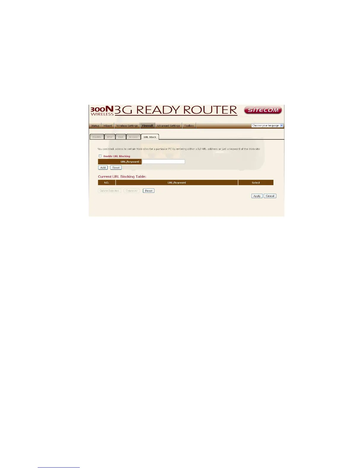 "Current URL Blocking Table", select the URL keyword you want to remove in the