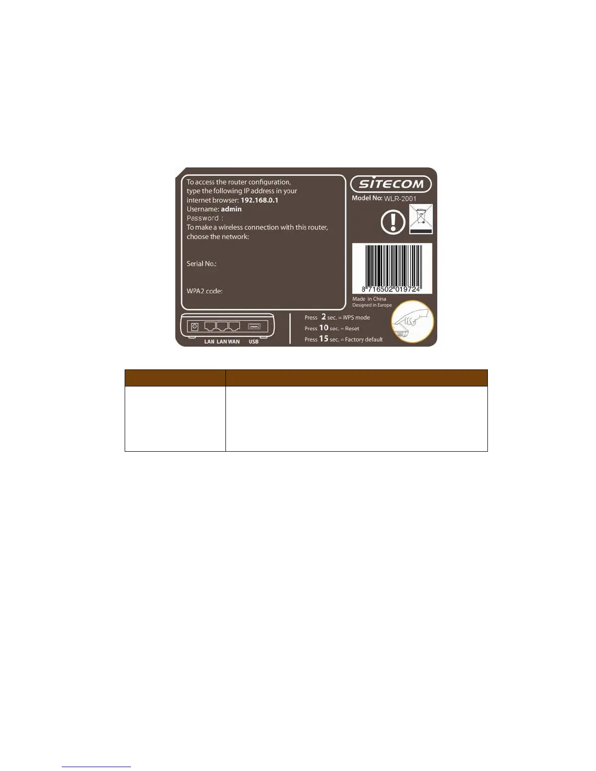 The back label describes the IP address, login details, SSID, security code and