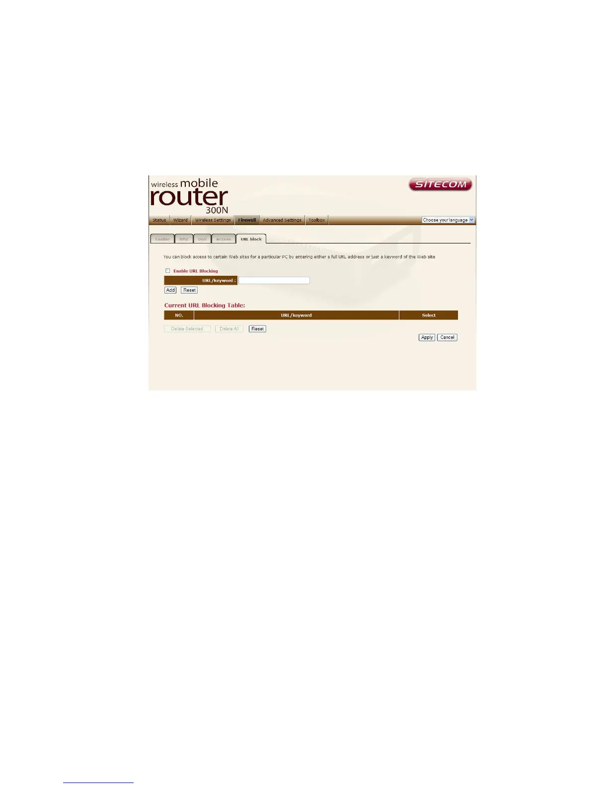 "Current URL Blocking Table", select the URL keyword you want to remove in the