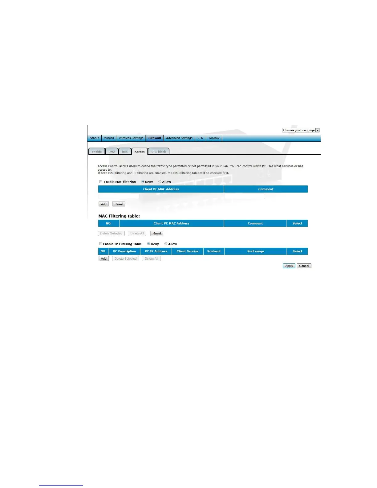 Deny If you select “Deny” then all clients will be allowed to access Internet