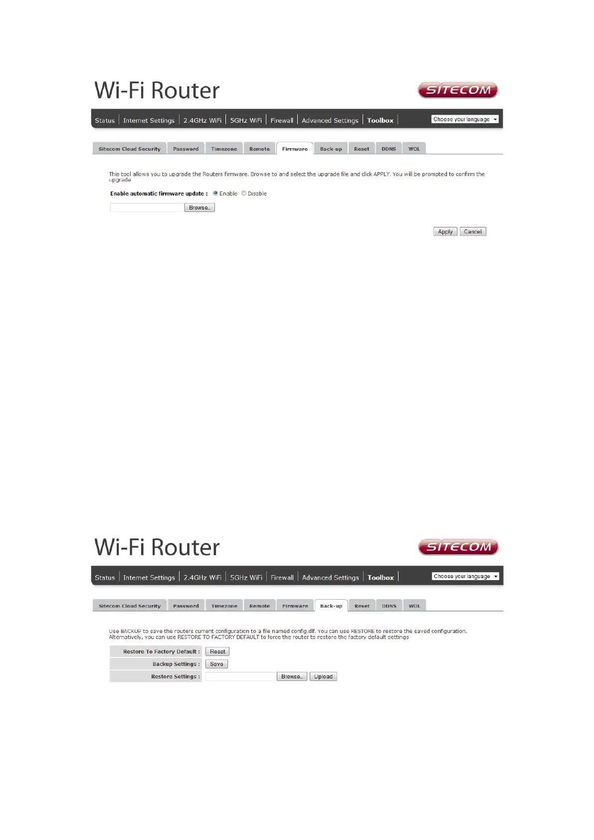 The Backup screen allows you to save (Backup) the current configuration settings. When
