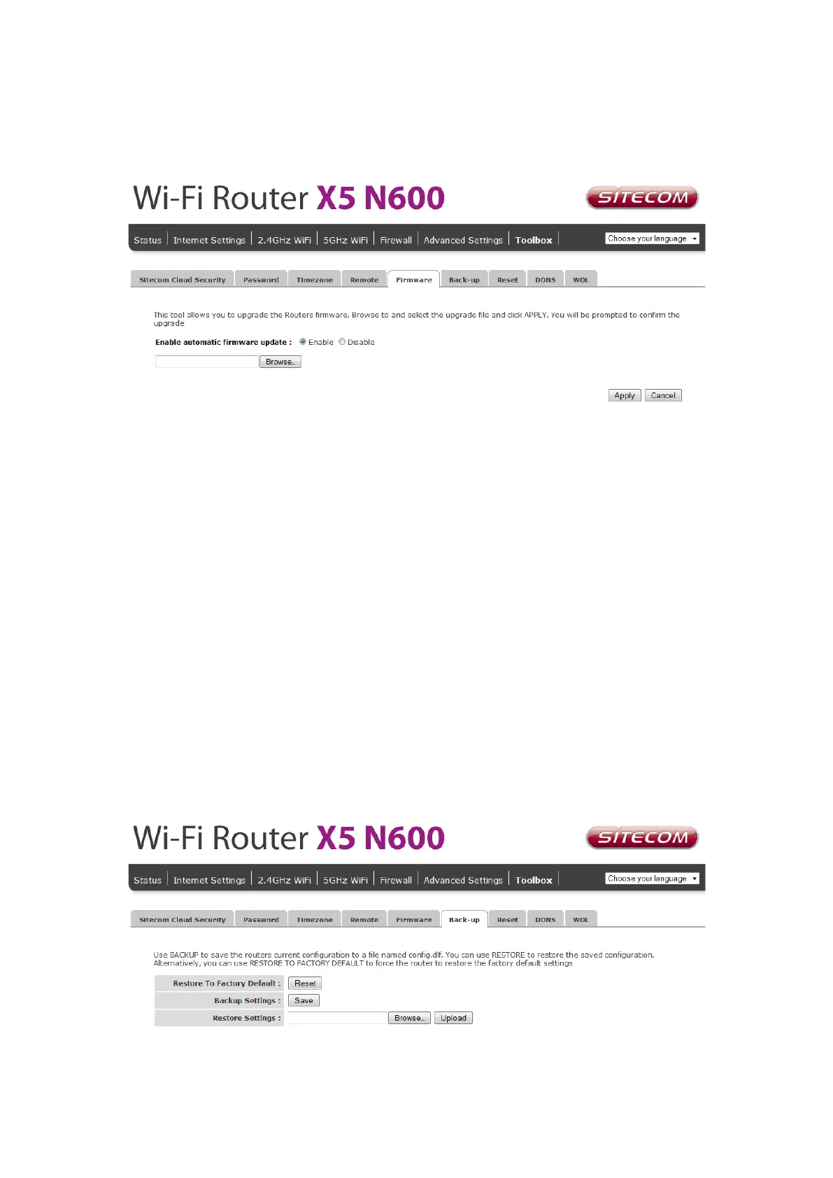 The Backup screen allows you to save (Backup) the current configuration settings. When