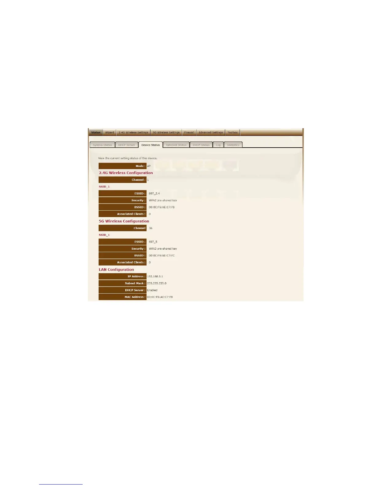 View the Broadband router’s current configuration settings. Device Status
