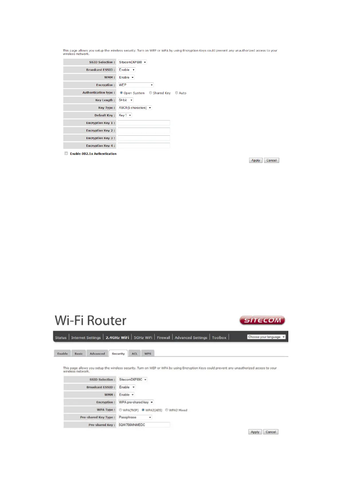 When you select 64-bit or 128-bit WEP key, you have to enter WEP keys to encrypt data. You can