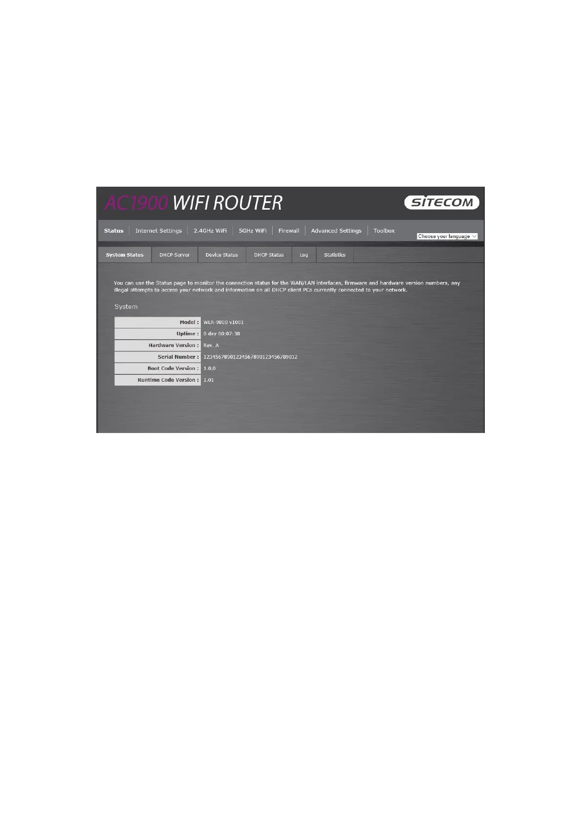The System status section allows you to monitor the current status of your router, the UP time,