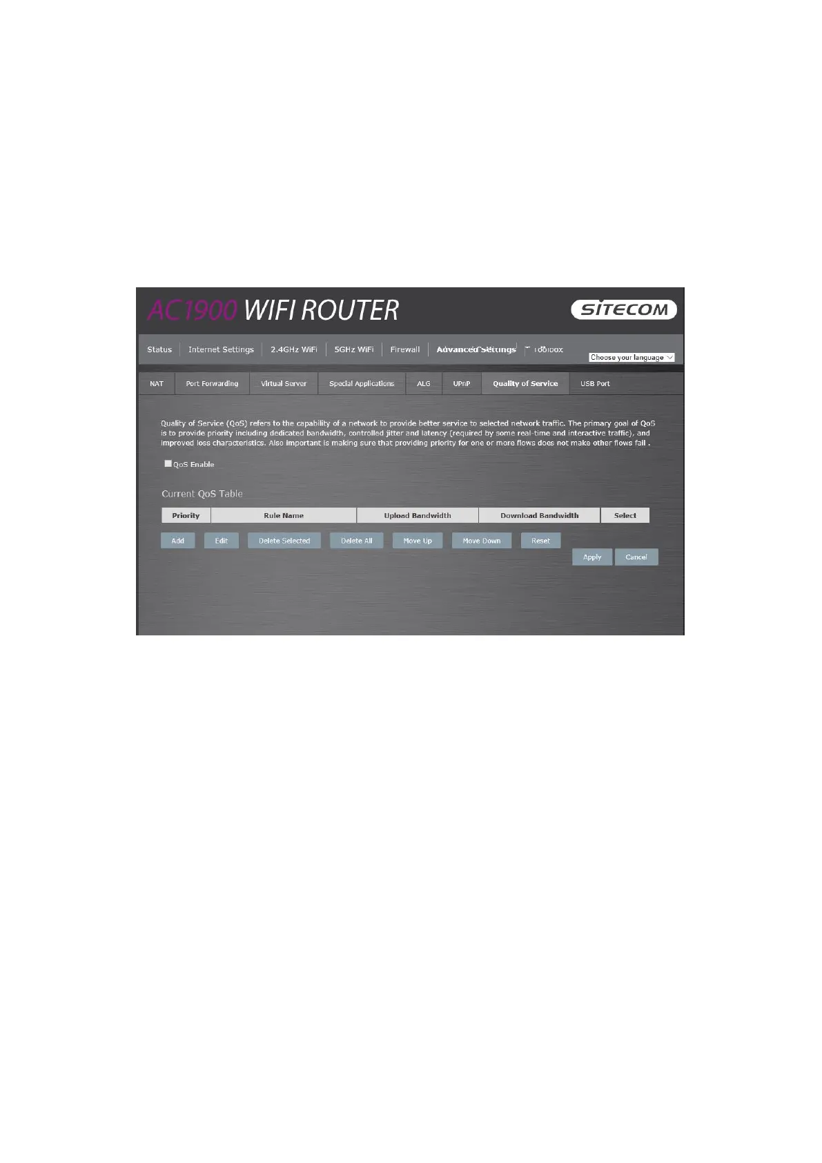 the QoS rules you want to remove in the table and then click "Delete Selected". If you