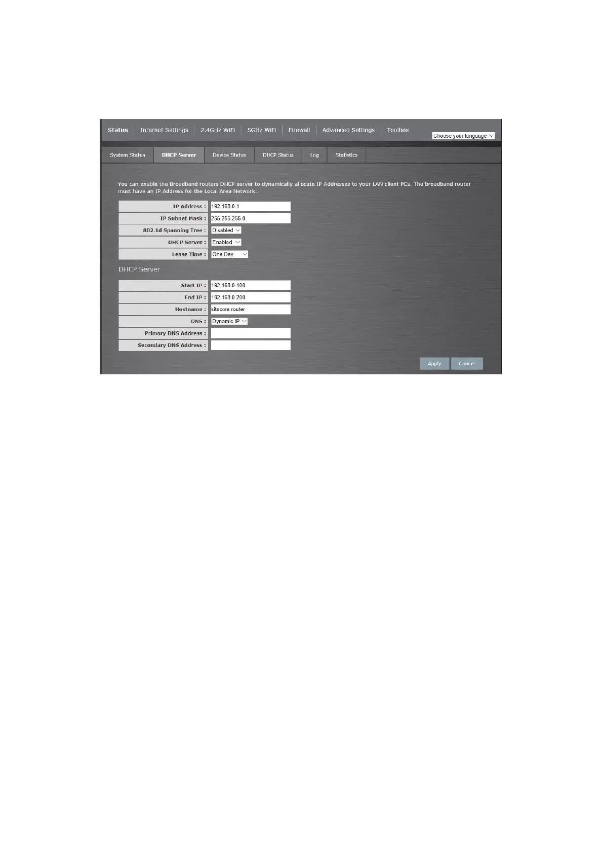 issue IP addresses to your LAN Clients. The default IP range is 192.168.0.100 ~