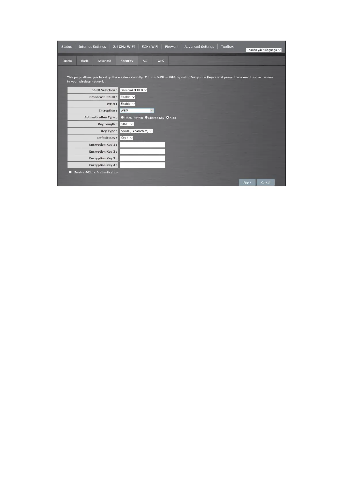 When you select 64-bit or 128-bit WEP key, you have to enter WEP keys to encrypt data. You can