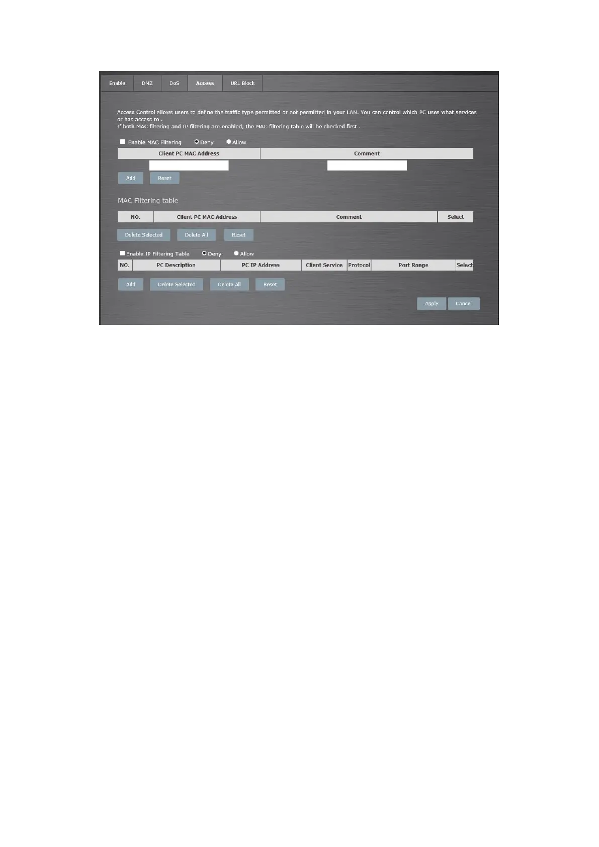 Filter client PCs by IP: Fill in “IP Filtering Table” to filter PC clients by IP.