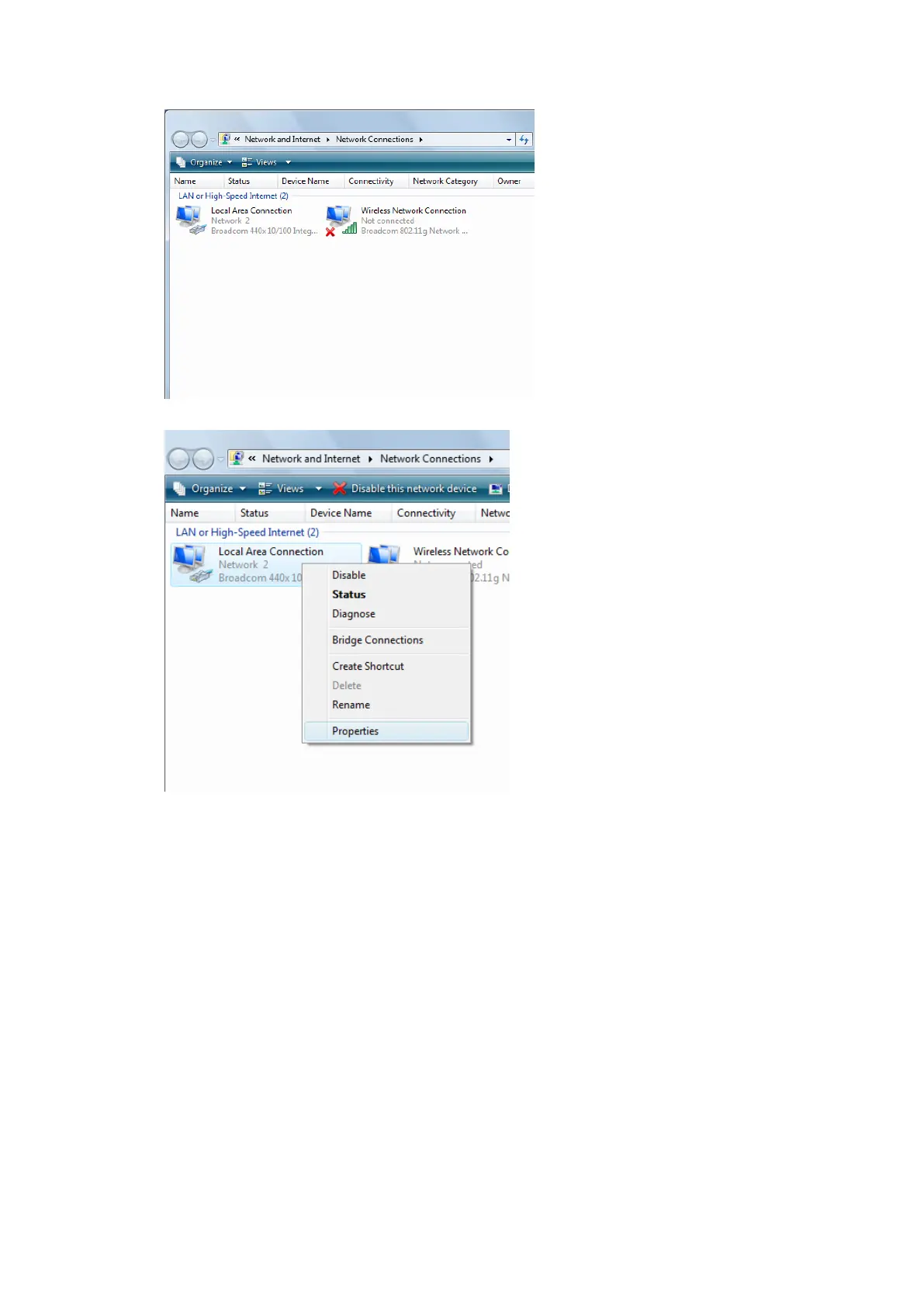 Select [Local Area Connection]) icon -> select [properties]