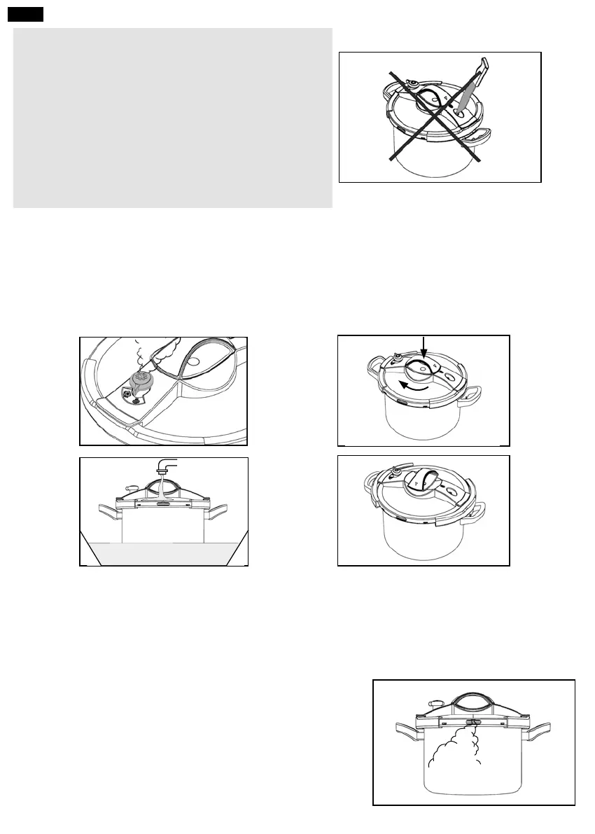 • Efectúe la descompresión de la olla girando la válvula (índice de la válvula apuntando al símbolo de chorro de vapor). El vapor