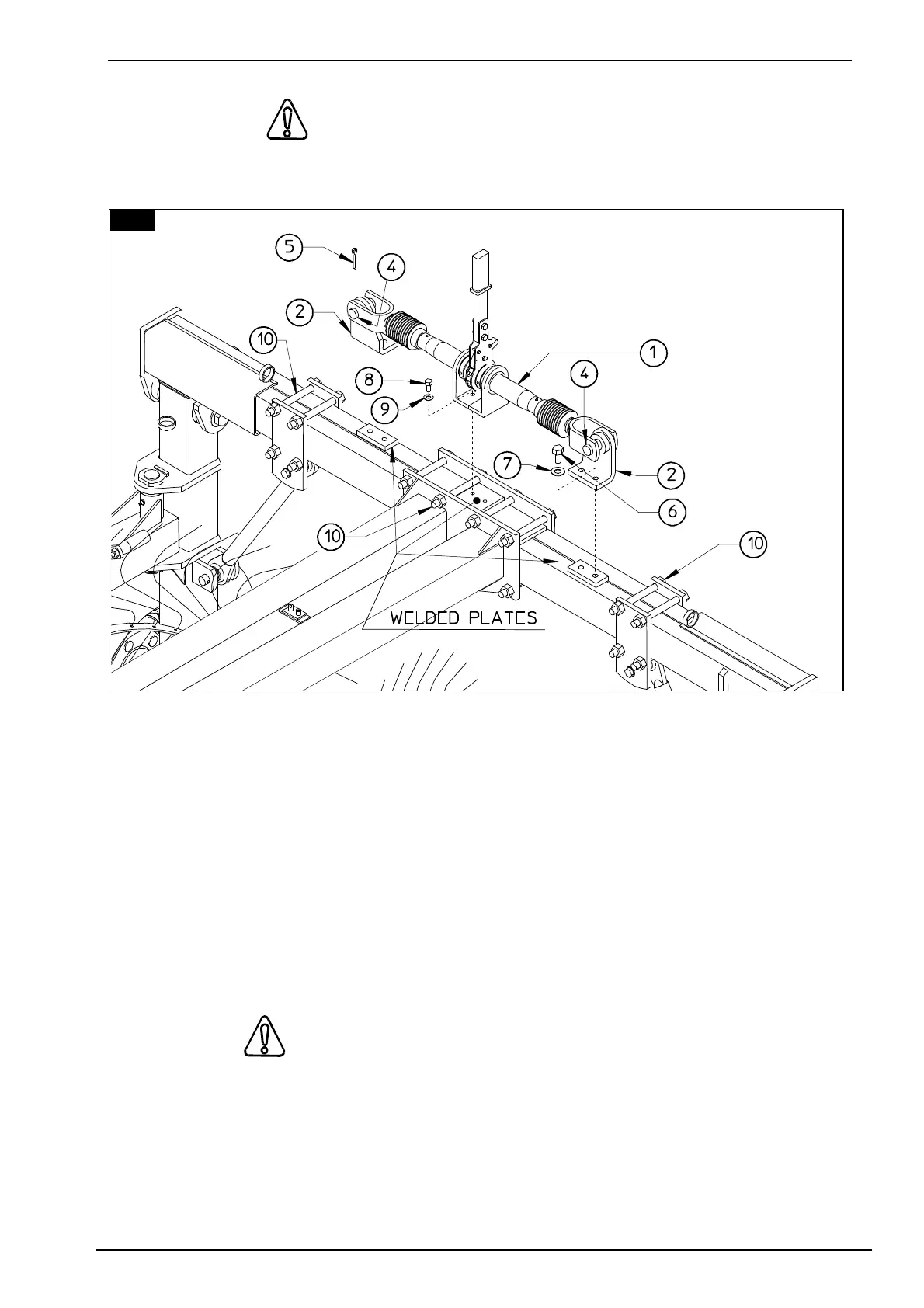 Attach the support 2 to the welded plates without tighten the screws 6 and washers 7. Mount the
