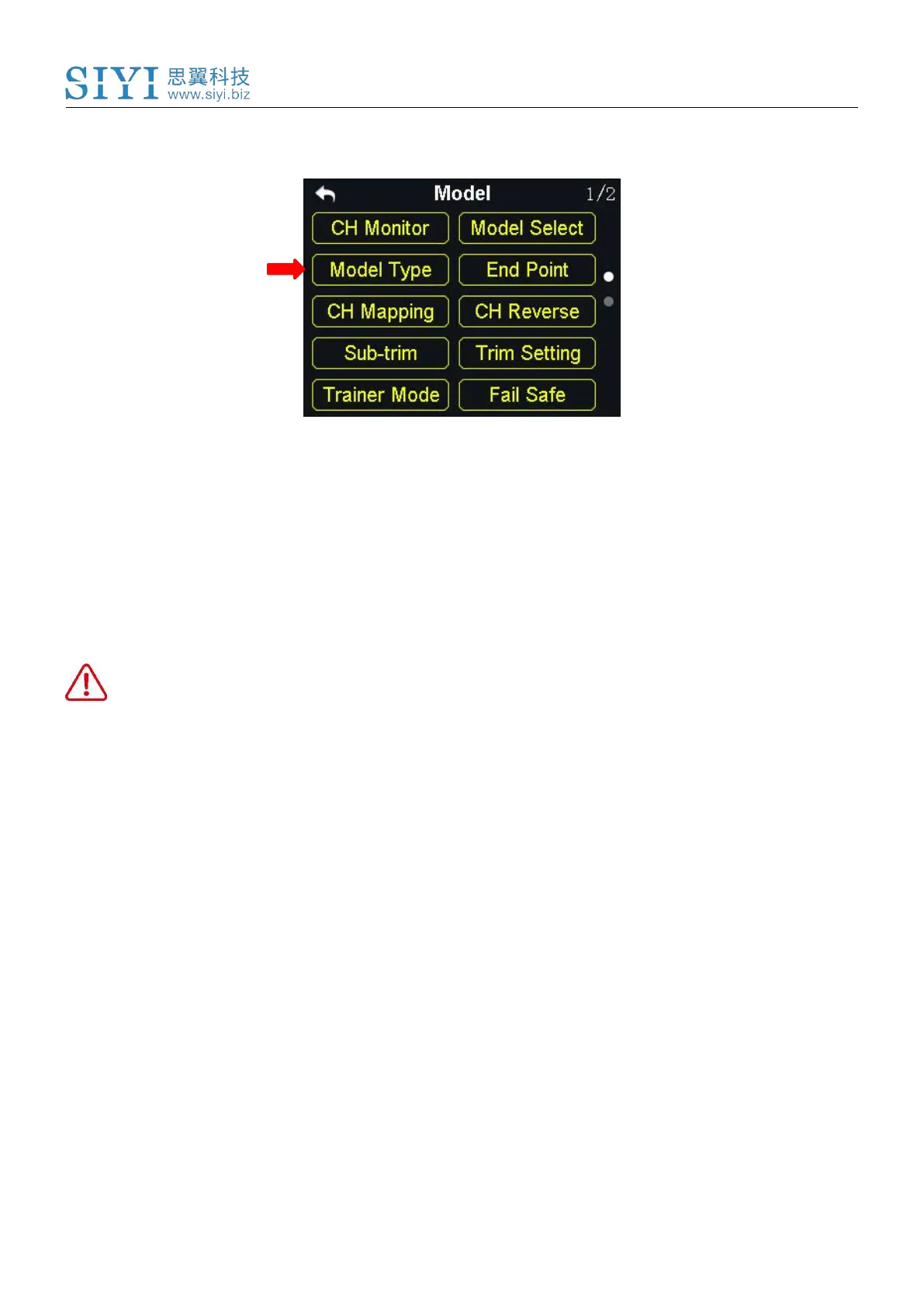 1. In the “transmitter settings” menu, tap on “Model Settings - Model Type”;