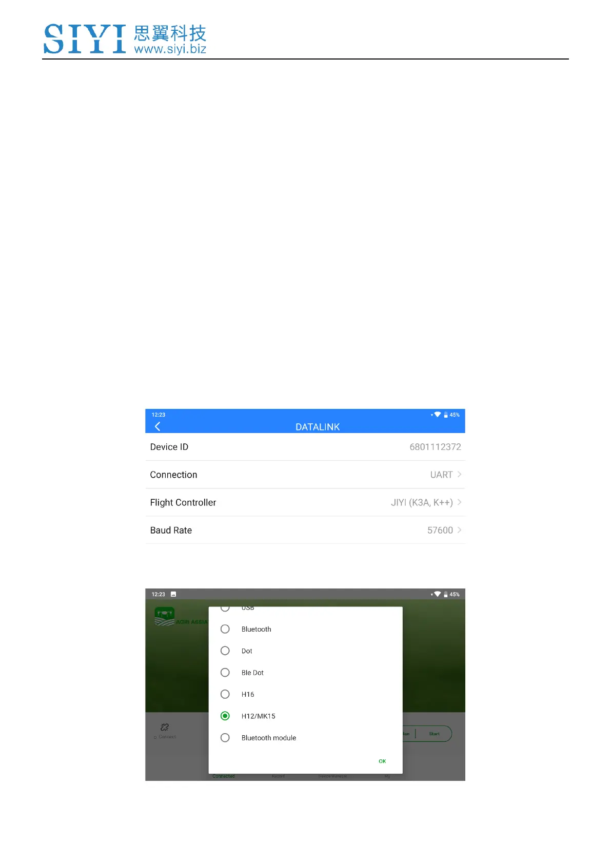 1. In “SIYI TX” app, go to “Datalink”, and choose “UART” in “Connection”, “JIYI
