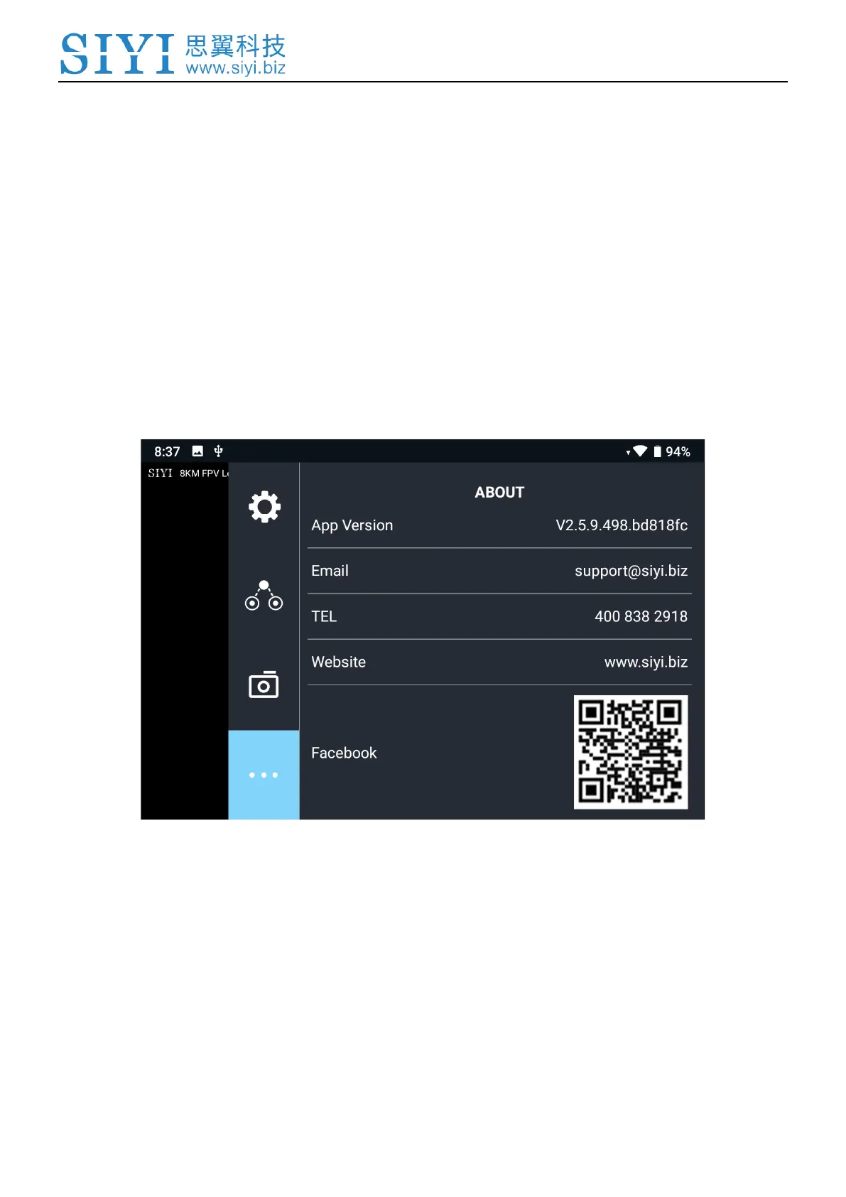 Displays the software version of SIYI FPV and common contact information of
