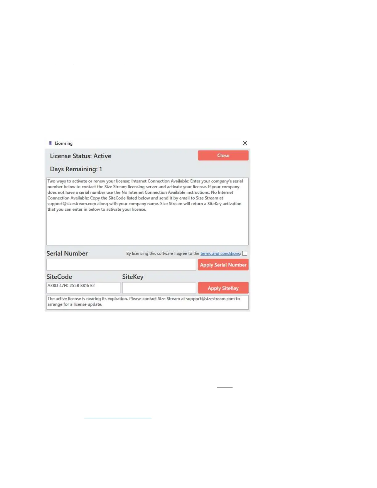 The License Information Window will appear when launching the Size Stream Software as an alert that you
