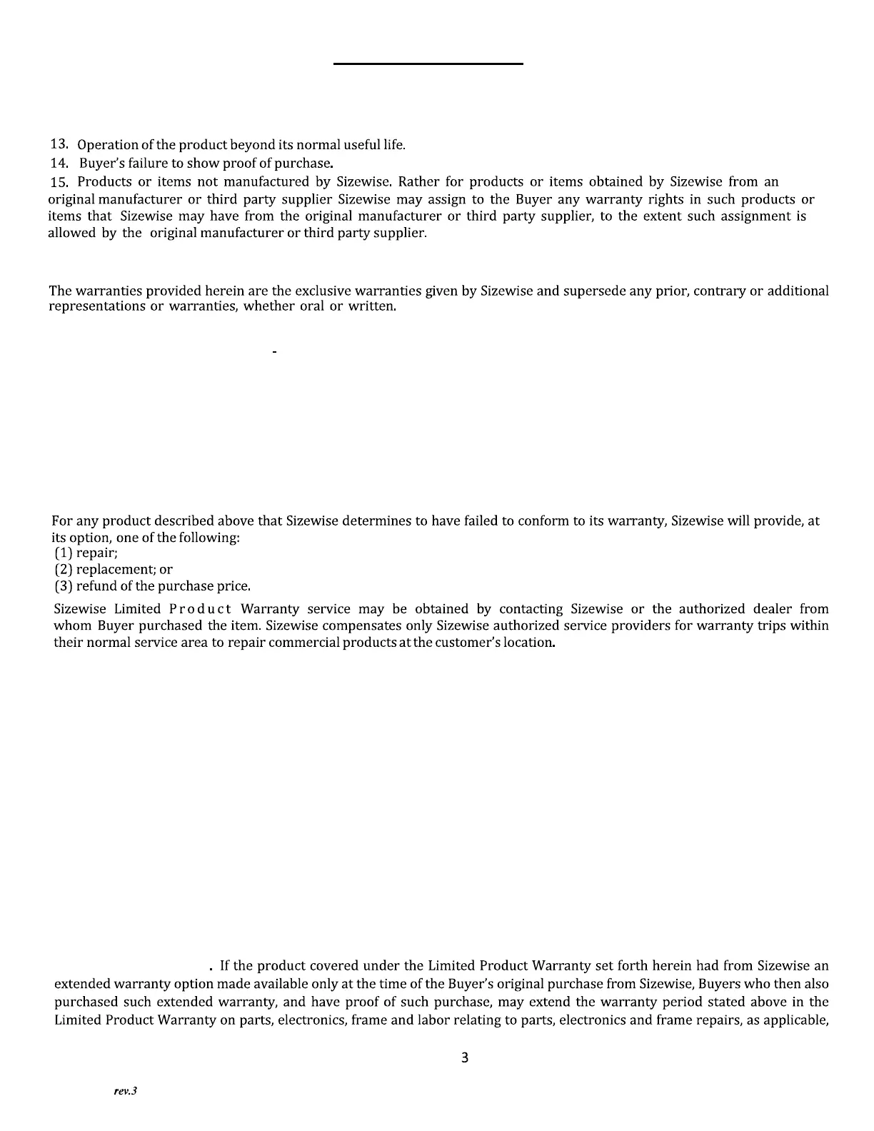 PRODUCT WARRANTY, SIZEWISE DISCLAIMS ANY AND ALL OTHER WARRANTIES WHETHER EXPRESS OR