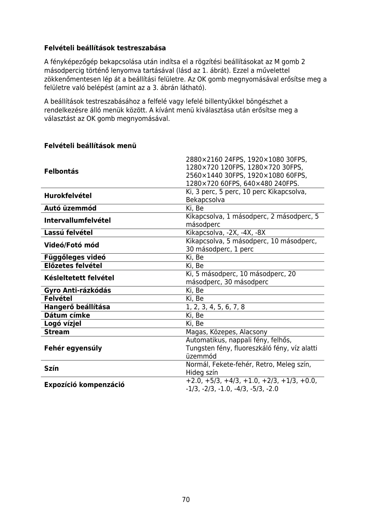 Felvételi beállítások menü