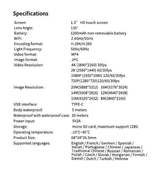 SJCAM C200PRO - Technical Specifications; Camera Specifications Details