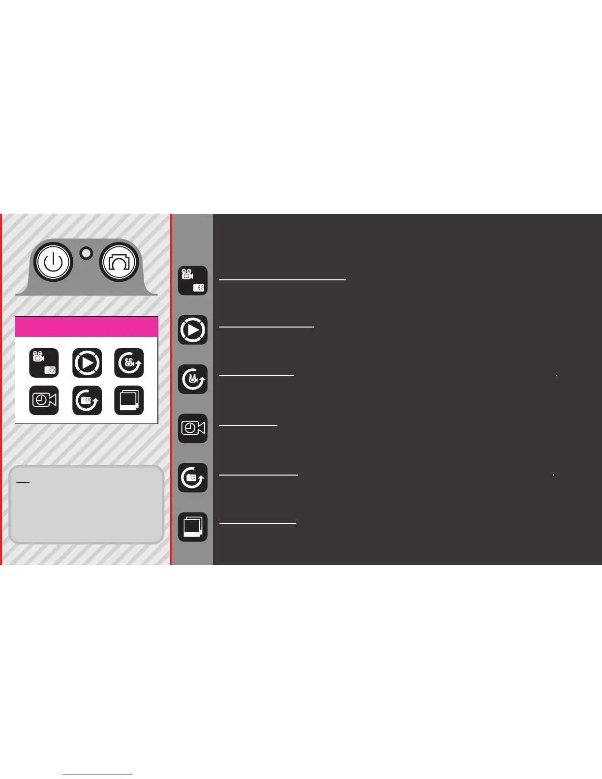 VIDEO / PHOTO MODE: Record videos or Still Photos.