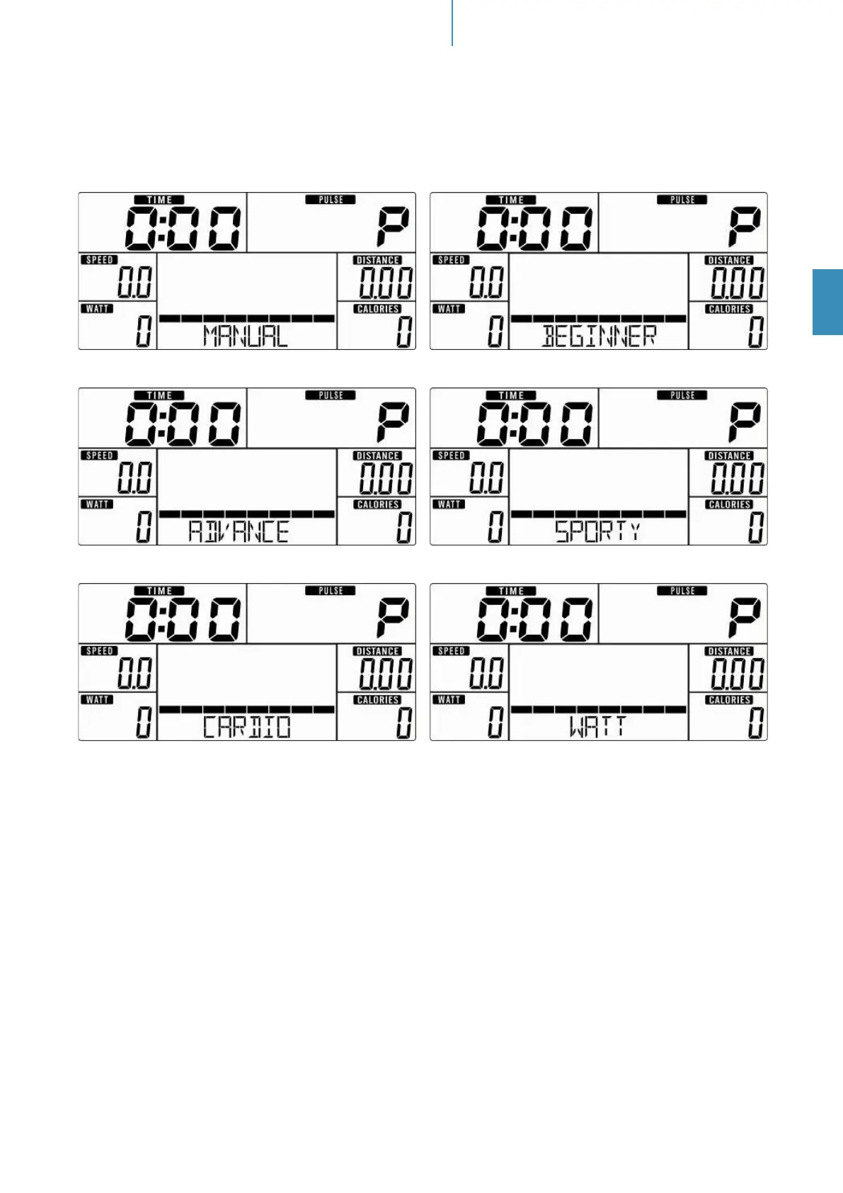 Manual (gure 2) -> Beginner (gure 3) -> Advance (gure 4) -> Sporty (gure 5) -> Cardio (gure 6) -> Watt