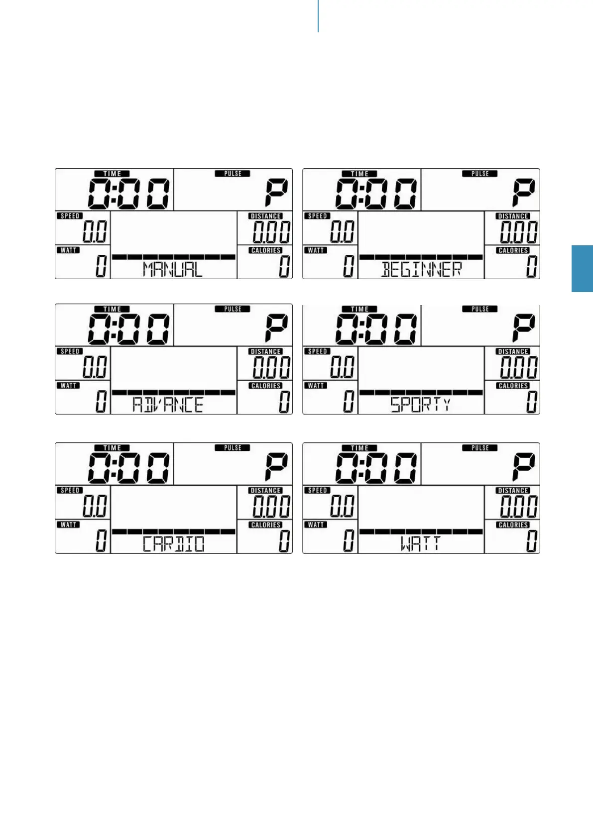 M (manuel, gure 2) -> Beginner (gure 3) -> Advance (gure 4) -> Sporty (gure 5) -> Cardio (gure 6) ->