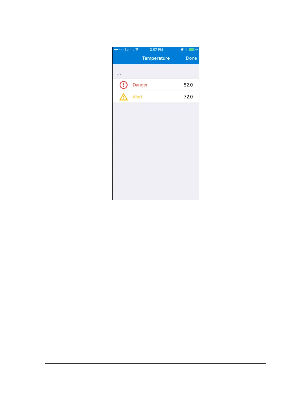 Tap the THRESHOLDS: Temperature field to navigate to the Temperature table.