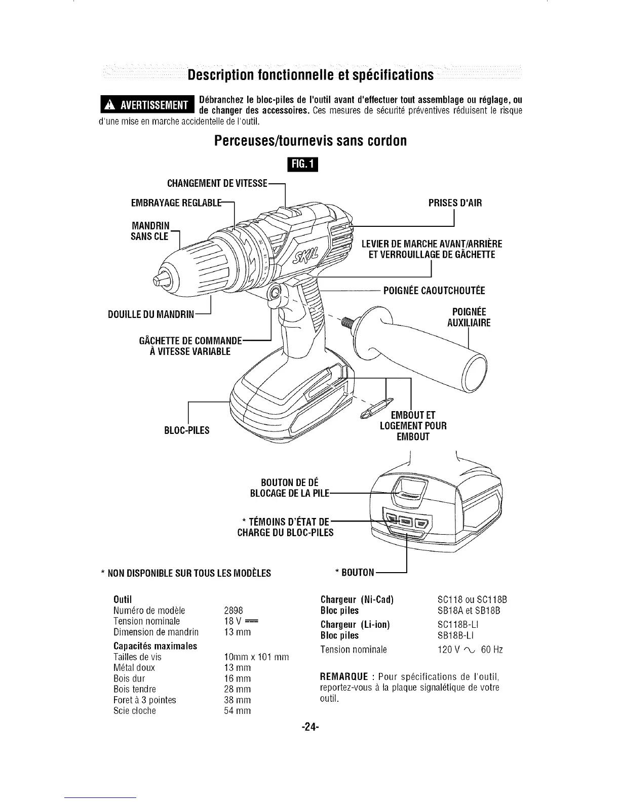 _ _branchez le bloc-piles de I'outil avantd'effectuertout assemblageou r6glage,ou