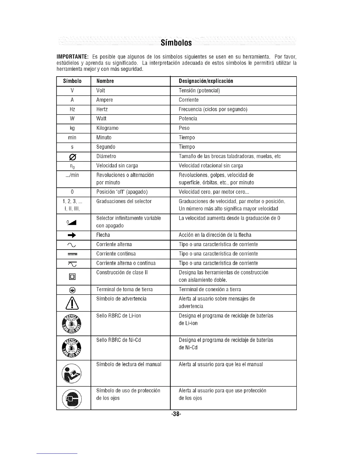IMPORTANTE: Es posible que algunos de los simbolos siguientes se usen en su herramienta. Por favor,