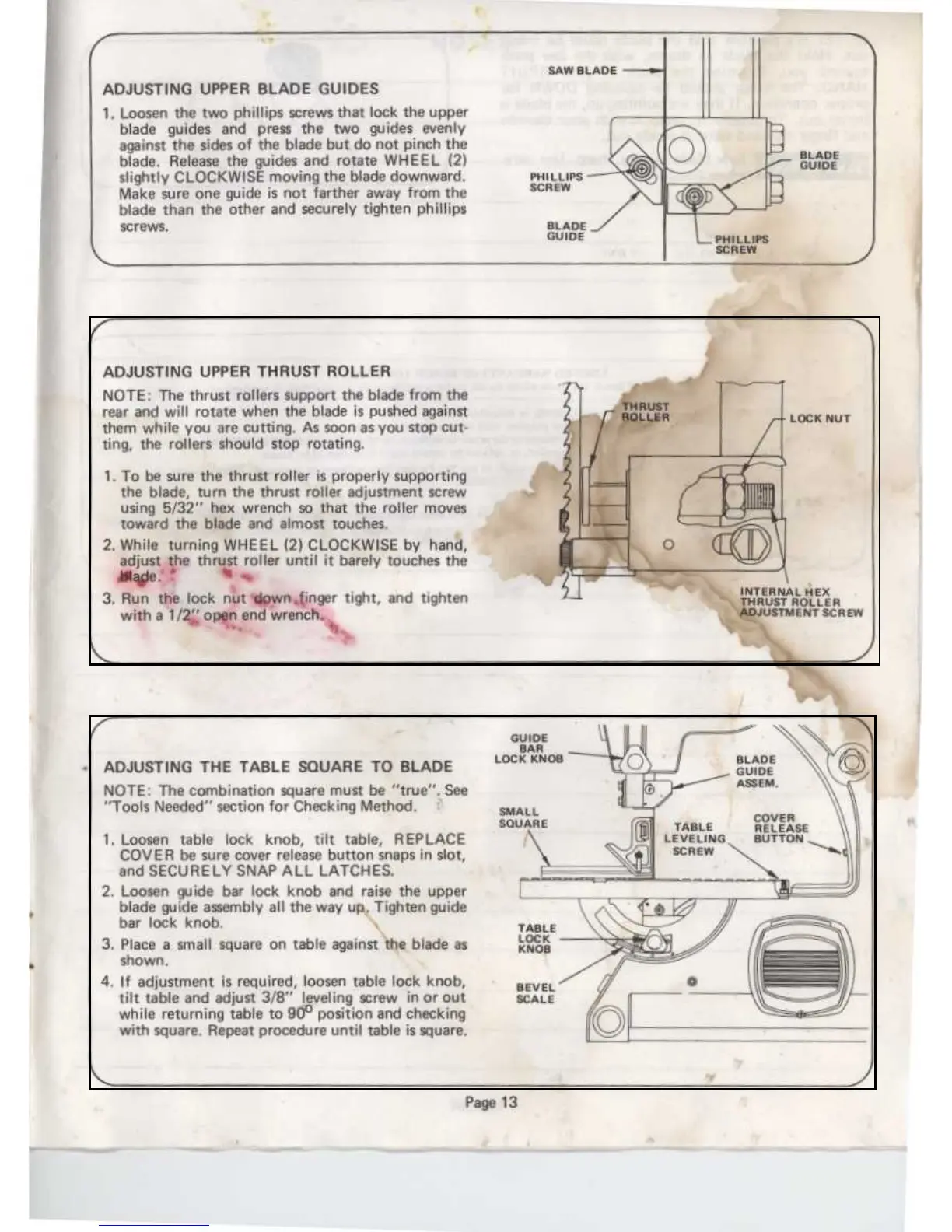 Skil 3104 - Adjusting Upper Blade Guides; Adjusting Upper Thrust Roller; Adjusting Table Square to Blade