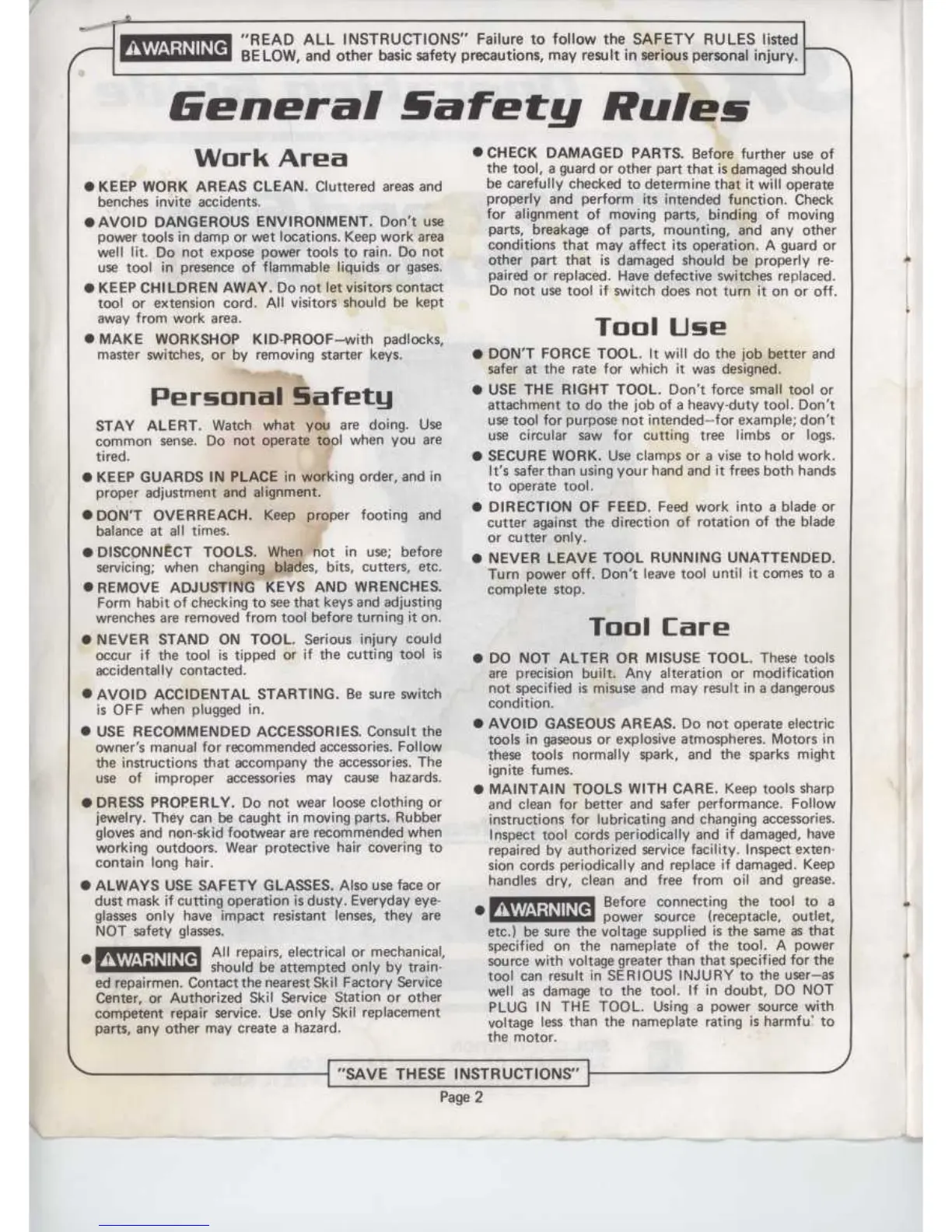 Skil 3104 - General Safety Rules; Work Area Safety; Personal Safety Precautions; Tool Usage Guidelines