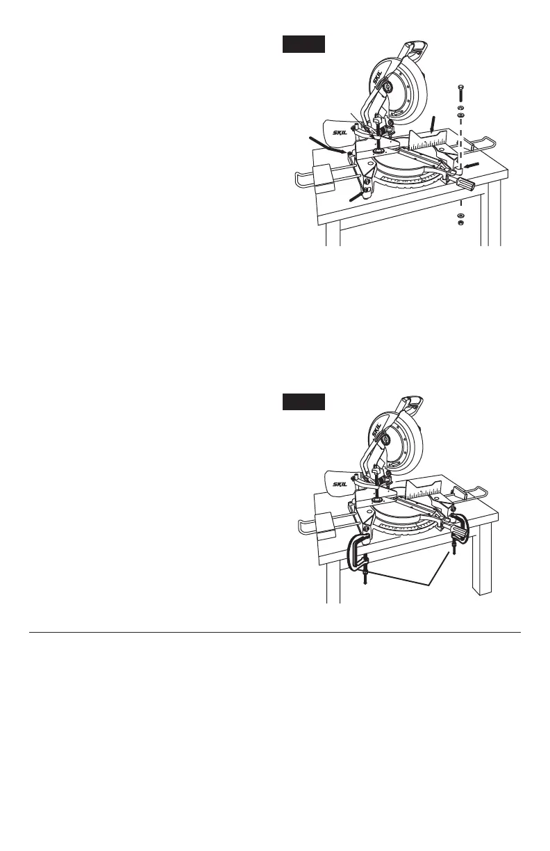 4. Placez la scie à onglet composée sur l’établi en alignant les trous de la base sur ceux