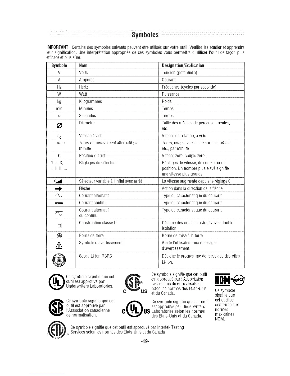 IMPORTANT: Certainsdes symboles suivants peuvent etre utilis_s sur votre outil. Veuillez les _tudier et apprendre