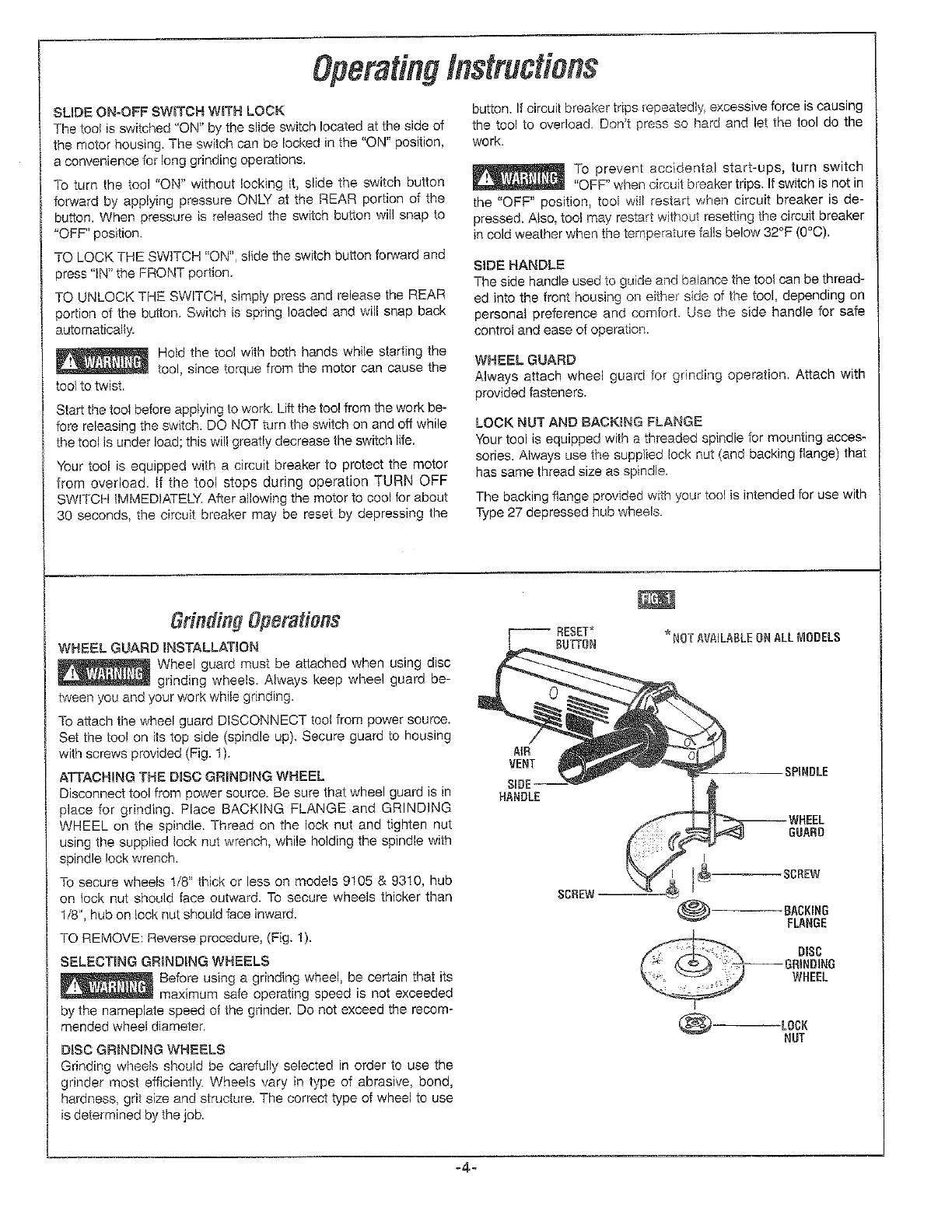 Skil 9310 - Operating Instructions; Switch and Circuit Breaker Operation; Side Handle and Wheel Guard; Grinding Wheel Mounting Procedure