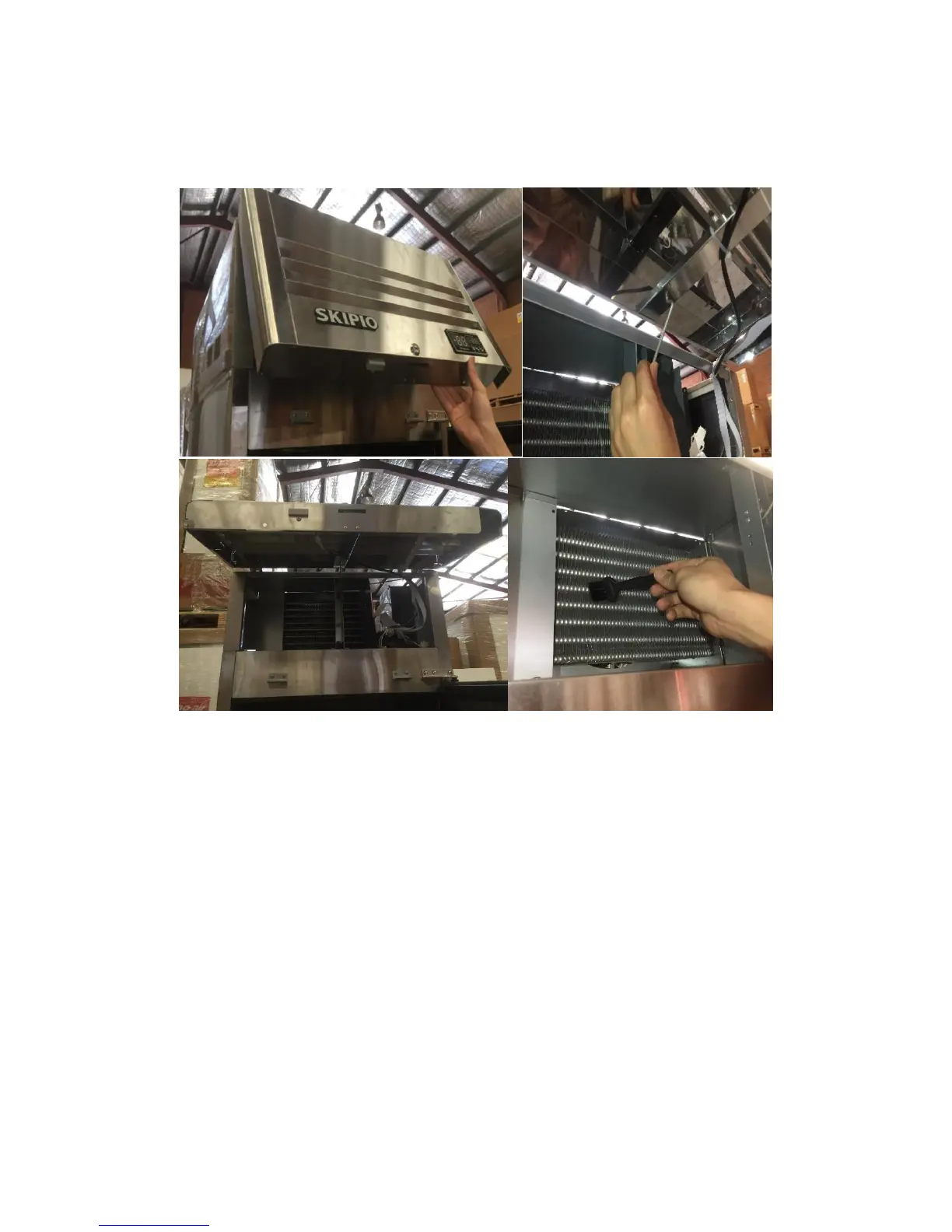 Lift top grille upwards and fix with prop. The prop is found within it’s housing, in front of condenser