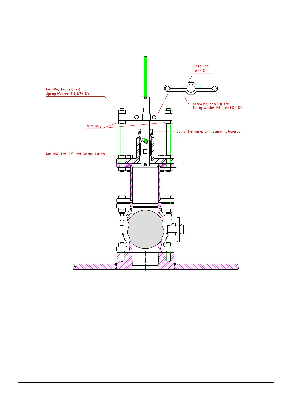 Mount Top Flange, Item (8). Secure with 8 washers, Item (29) and nuts, Item (28). Torque: 130 Nm.