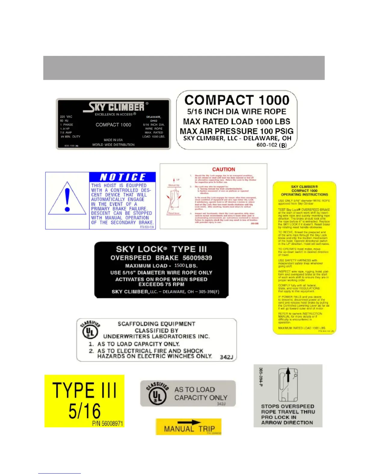 Sky Climber Compact 1250 - Decals Specific to Compact 1000 Model; Safety Decals & Instructions