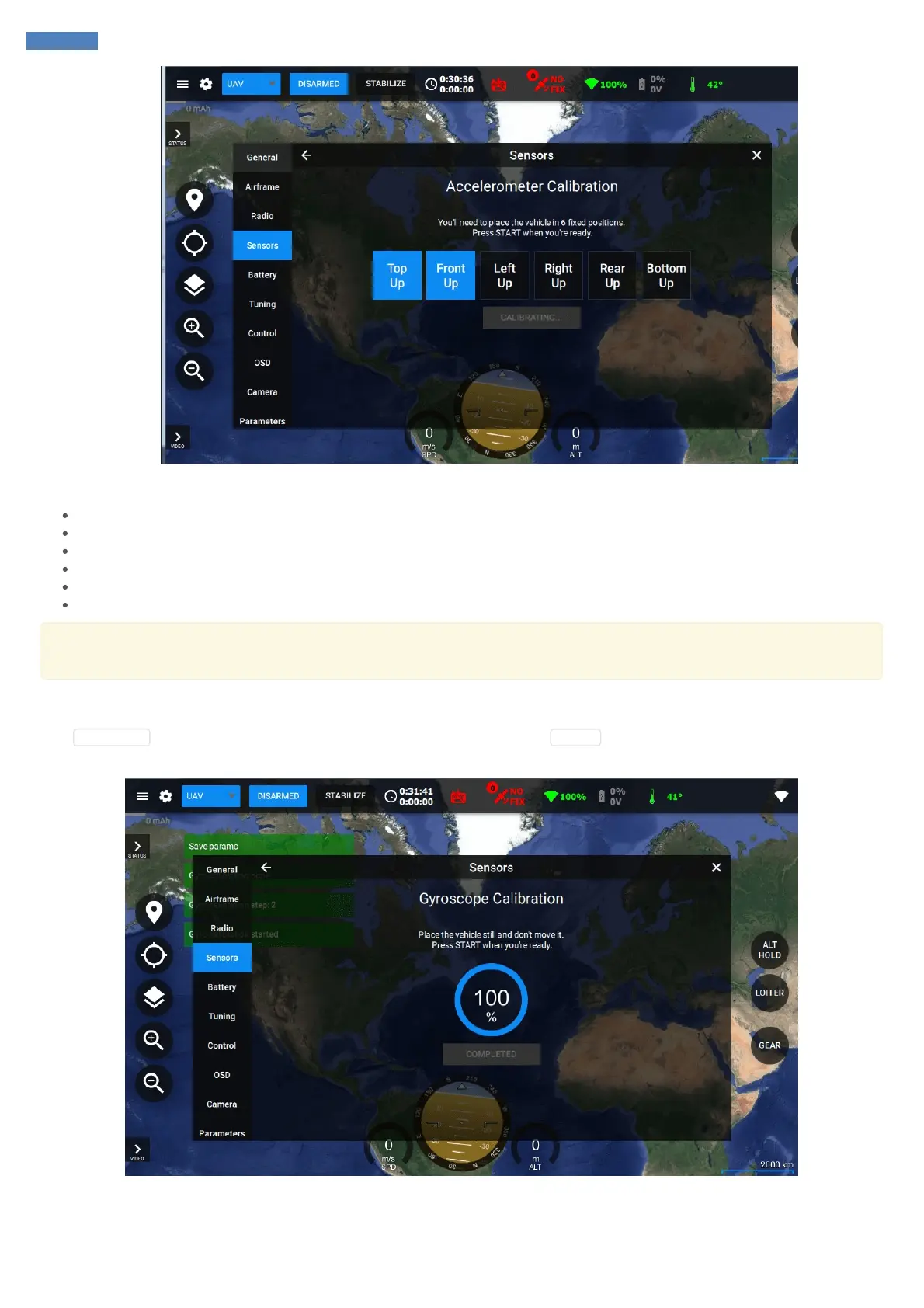 Click CALIBRATE button near gyroscope data. Don’t move the board, put it still, click START and follow the instructions which will be shown
