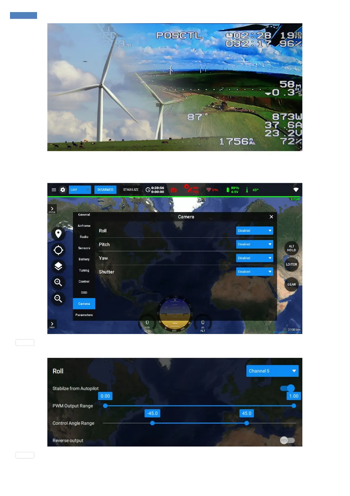 Camera tab allows you to configure the camera gimbal and shutter control settings.