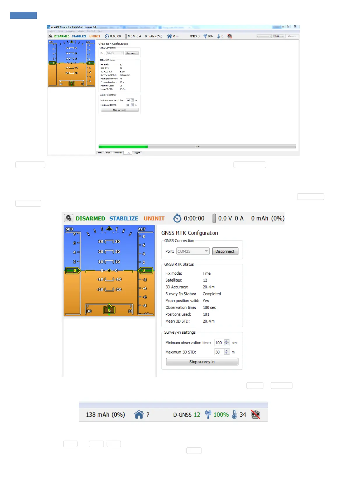 After Survey-In process is completed SmartAP GCS will start sending corrections to the Rover. Survey-In status will change from In Progress to